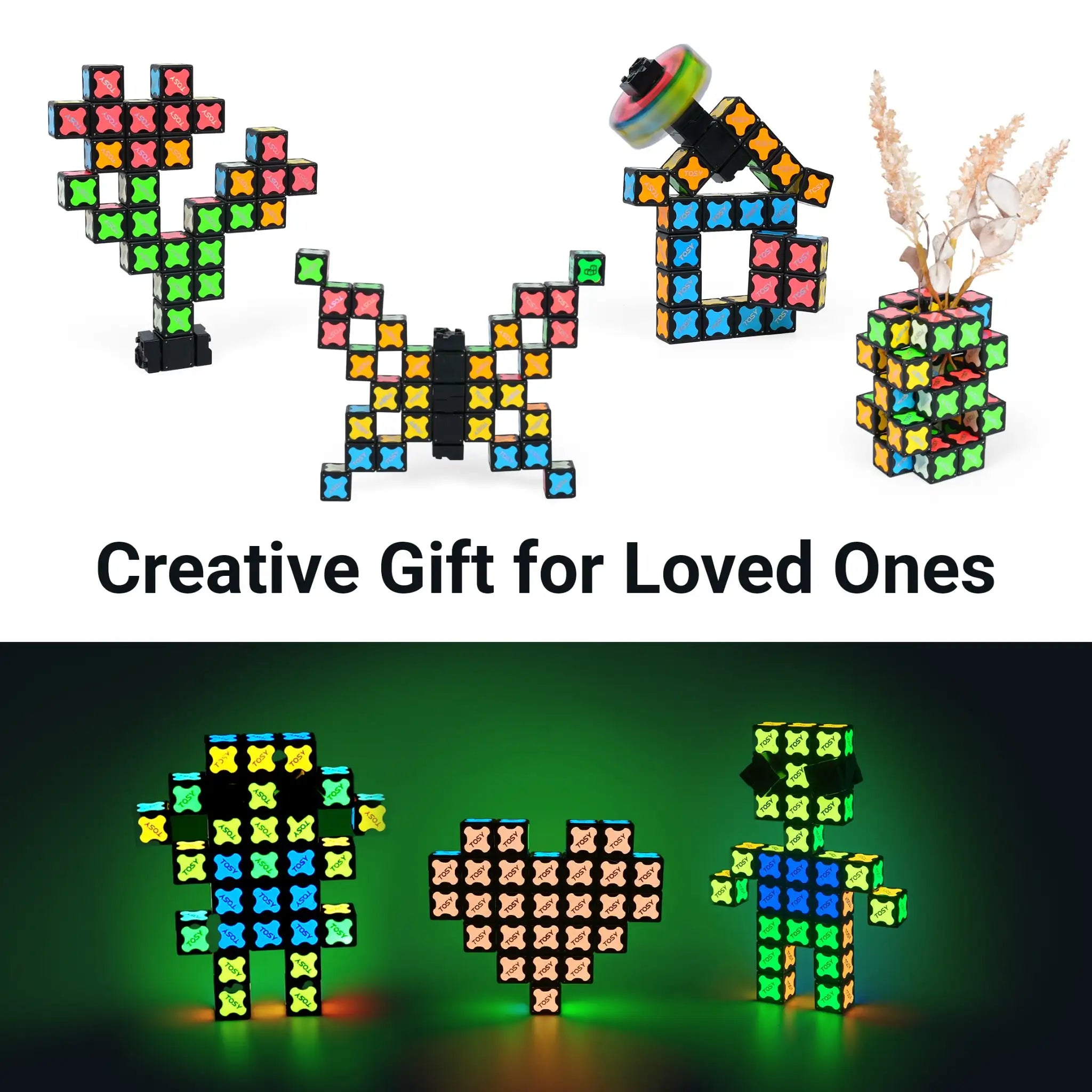 - 6 IN 1 TOY: BUILIDING BLOCKS - PUZZLE CUBE 3x3 - PUZZLE CUBE 2x2 - FIDGET SPINNER - INFINITY CUBE - 2D PUZZLE GAME. Refer to our booklet to explore all these fun games. The included UV Flashlight creates beautiful glow-in-the-dark effect
